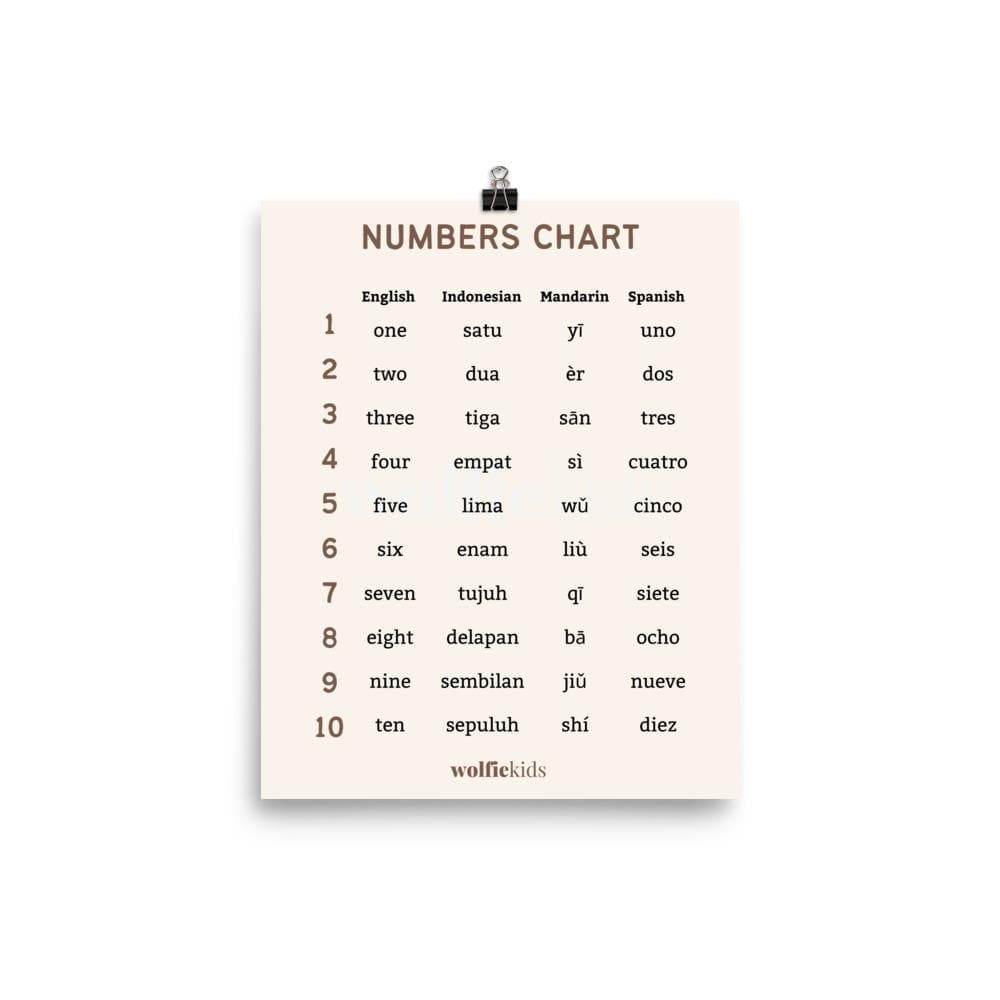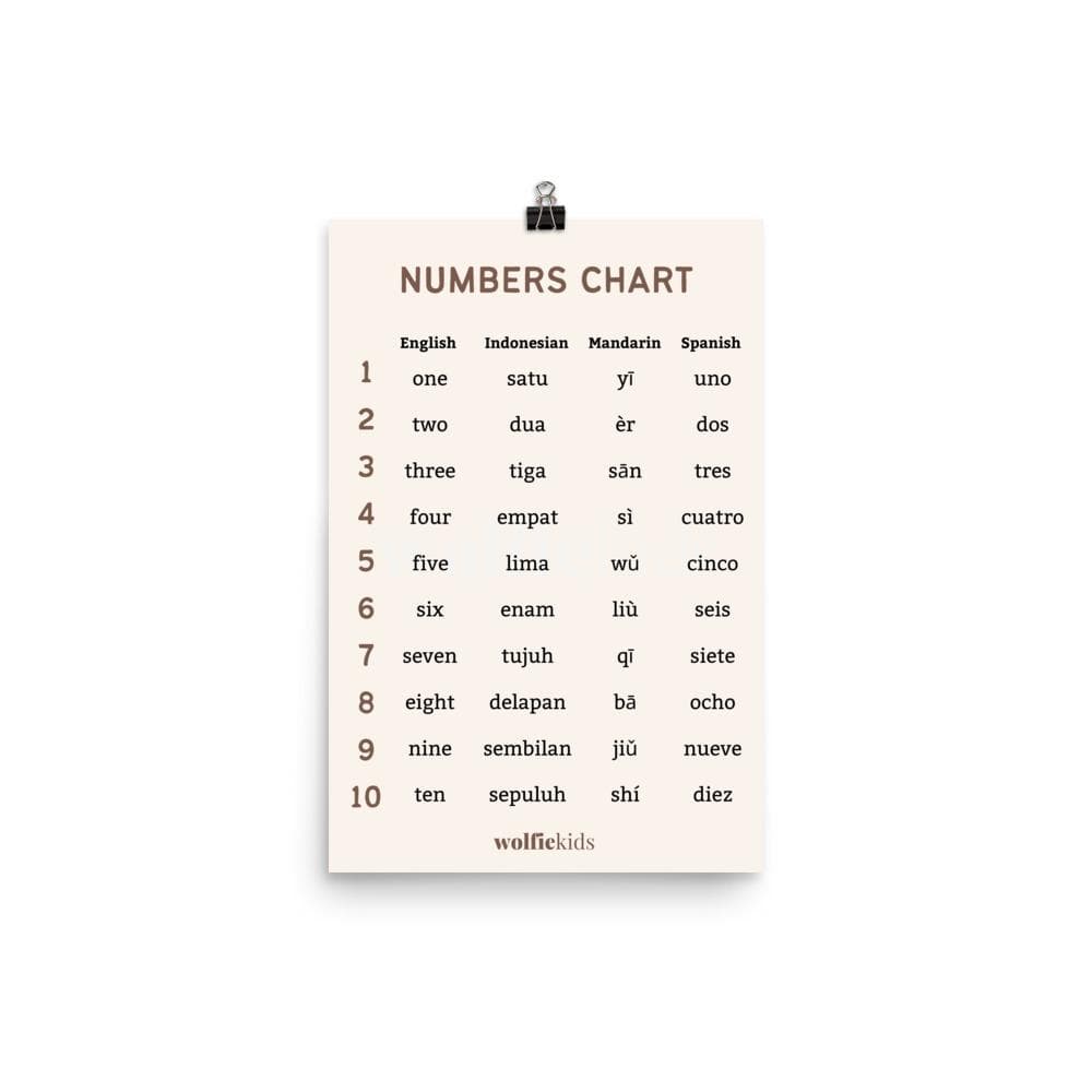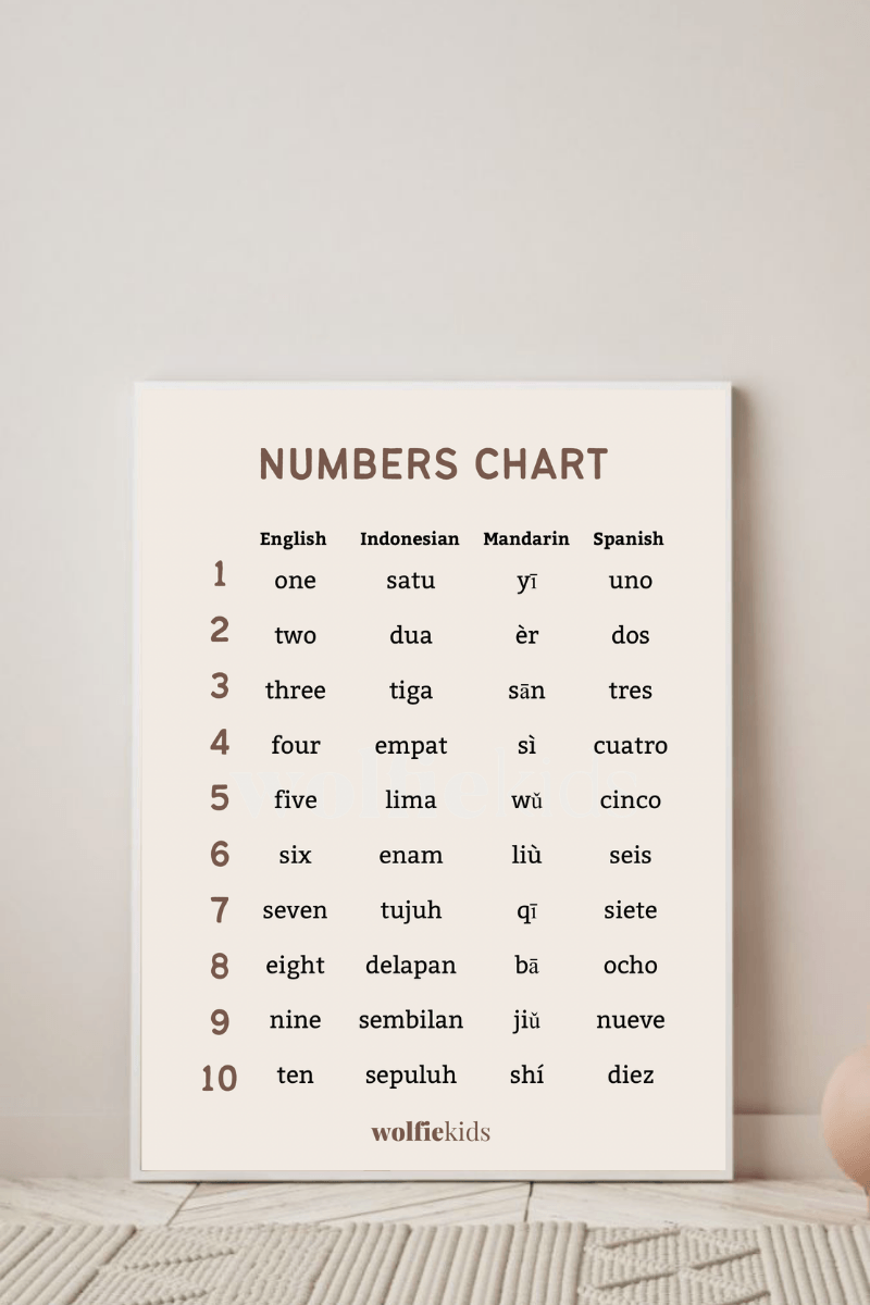 Level up counting up to ten with Wolfie's counting chart. Featuring English, Indonesian, Mandarin and English translations of numbers to teach your kids a basic math skill and a foundation to other languages as well.